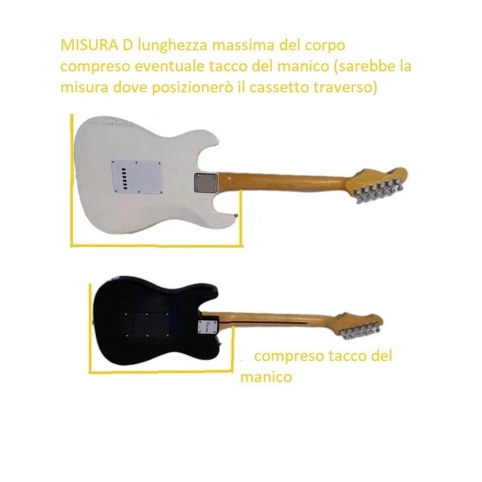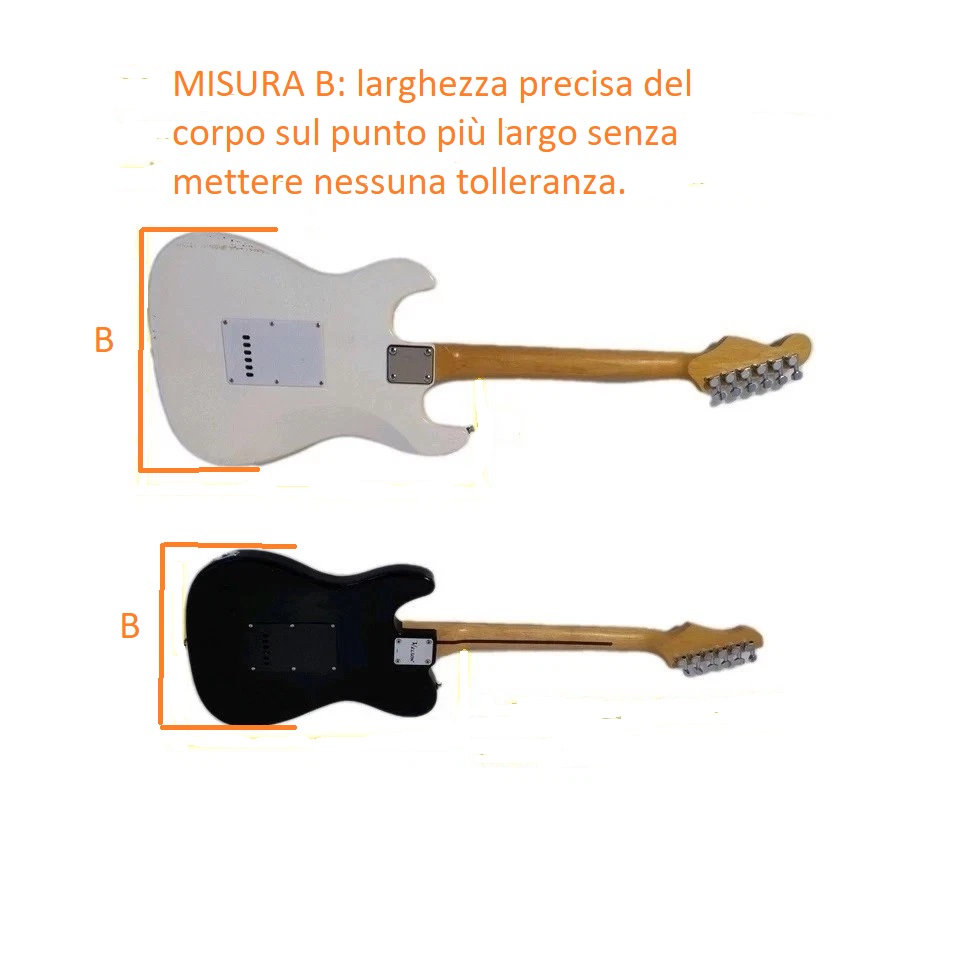 · MISURA A: lunghezza totale dalla chitarra compreso pomello tracolla + aggiungere un centimetro di tolleranza (esempio se la chitarra compreso pomello è lunga 103, la misura da comunicare A = 104)