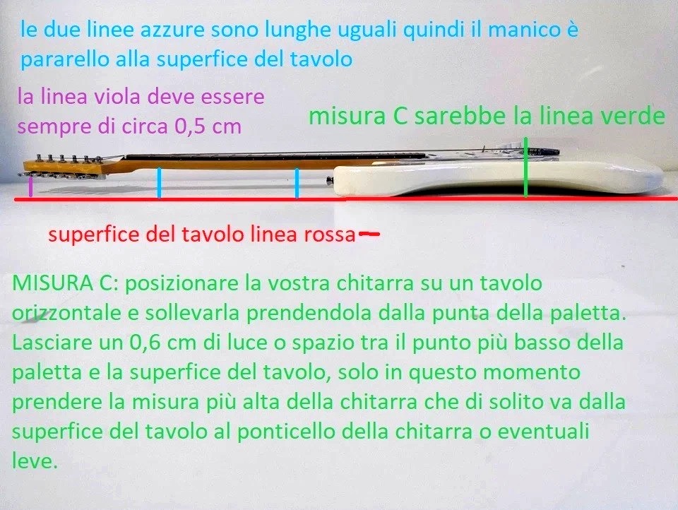· MISURA C: posizionare la vostra chitarra su un tavolo orizzontale e sollevarla prendendola dalla punta della paletta. Lasciare un 0,6 cm di luce o spazio tra il punto più basso della paletta e la superfice del tavolo, solo in questo momento prendere la misura più alta della chitarra che di solito va dalla superfice del tavolo al ponticello della chitarra o eventuali leve.